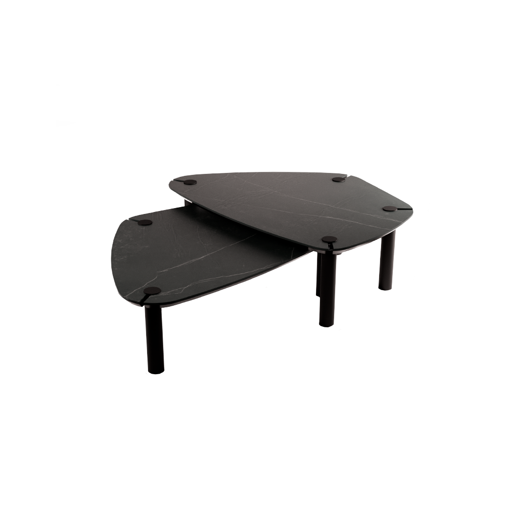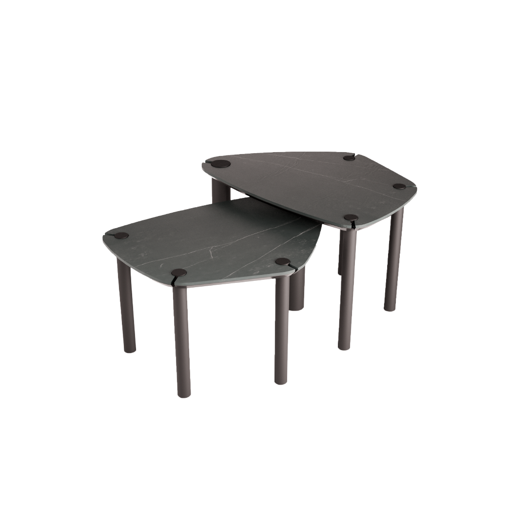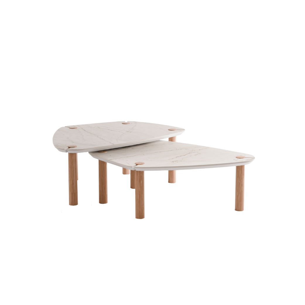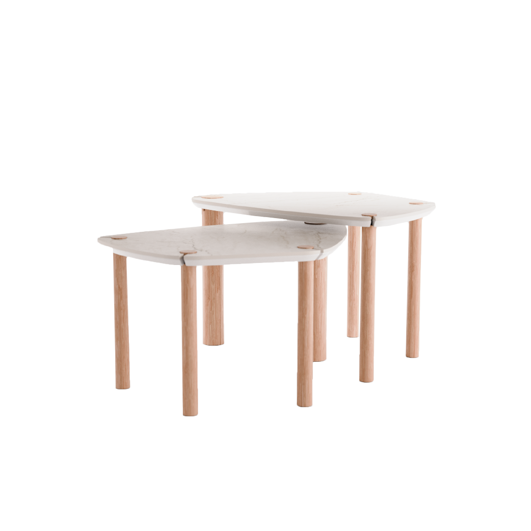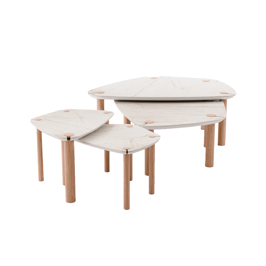 Piedra sinterizada de 6mm u 8mm, de diferentes colores y texturas. Madera laqueada o madera enchapada.